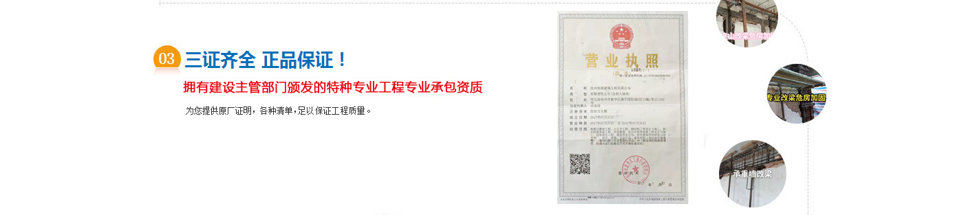 是滄州加固施工公司的企業(yè),具備結(jié)構(gòu)補(bǔ)強(qiáng)資質(zhì),并通過ISO9001:2000國際質(zhì)量管理體系認(rèn)證、環(huán)境管理體系認(rèn)證、安全管理體系認(rèn)證!" />